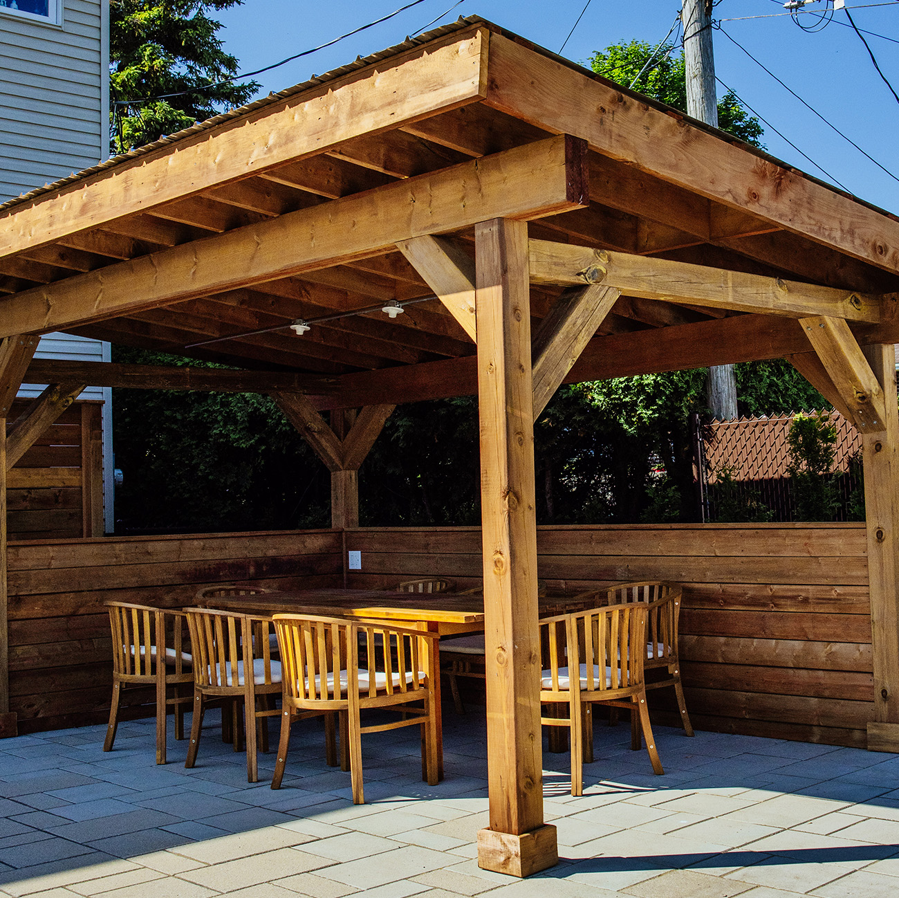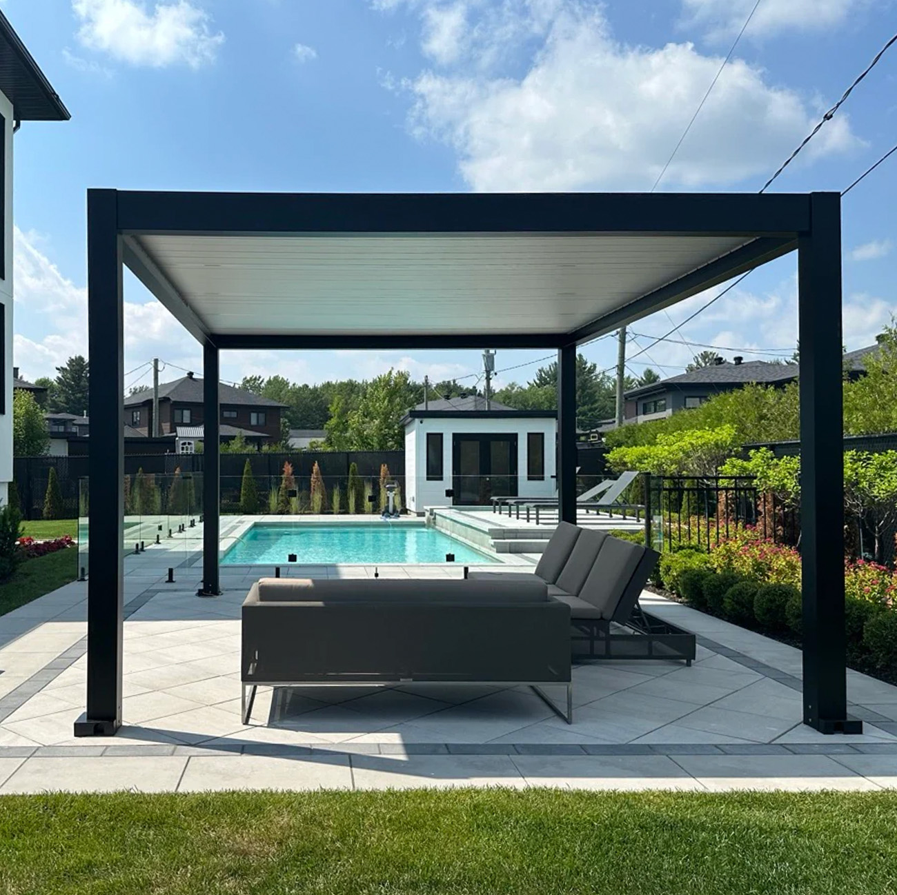 Conçue pour affronter les réalités du climat québécois, elle s’adapte aussi bien aux étés chauds qu’aux périodes plus fraîches. Les lames ajustables peuvent être ouvertes pour laisser entrer le soleil et l’air frais, ou inclinées afin de créer une ombre confortable et protectrice lors des journées plus intenses.
